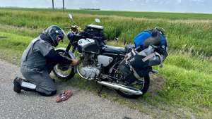 He’s one of the country’s foremost authorities on old Superhawks, which helped when Ben Boyer’s identical 1966 CB77 broke down beside the road just a few hours after leaving Minneapolis, almost at the North Dakota state line. The exhaust worked loose from the cylinder head and needed a new stud and flange. The bike was loaded on the back of a following SUV and carried here to Oakes, another couple of hours away, where a local machinist worked into the night at his home shop to create a new flange. When he delivered it the next morning, there was no charge. “That’s the kind of person you meet on a trip like this, riding a bike like this,” says Boyer, a retired high school biology teacher from Colorado. “This kind of trip really brings out the best in people.”